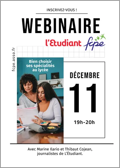 La FCPE organise en partenariat avec L’Etudiant un webinaire intitulé « Bien choisir ses spécialités au lycée » le jeudi 11 décembre 2025 de 19h à 20h.