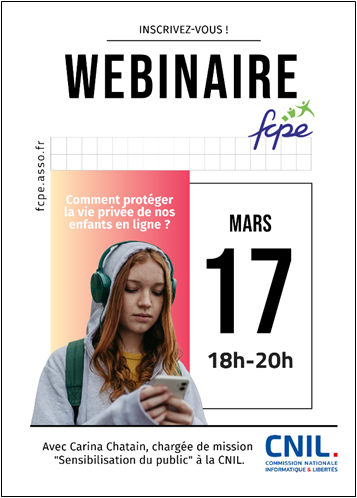 La FCPE, en partenariat avec la CNIL (Commission nationale Informatique et Libertés), vous invite à participer à un webinaire intitulé « Comment protéger la vie privée de nos enfants en ligne ? » le 17 mars 2026, de 18h à 20h.