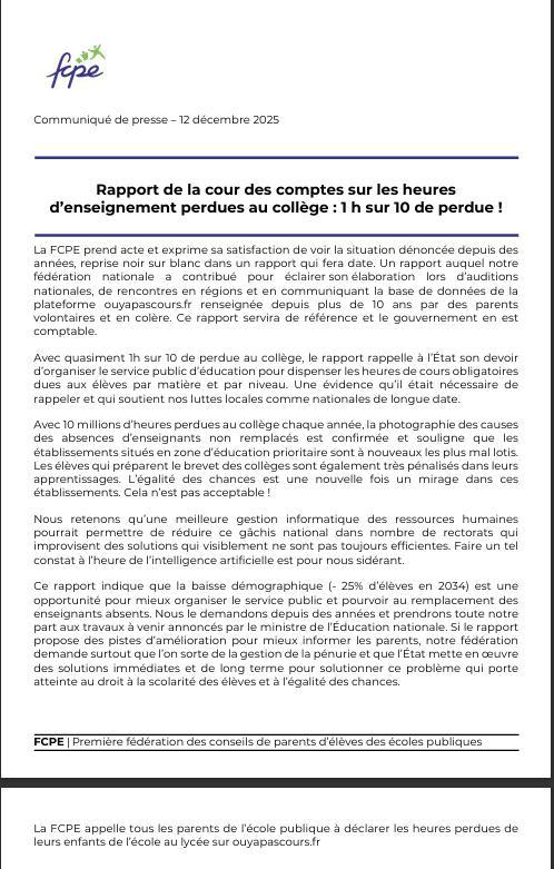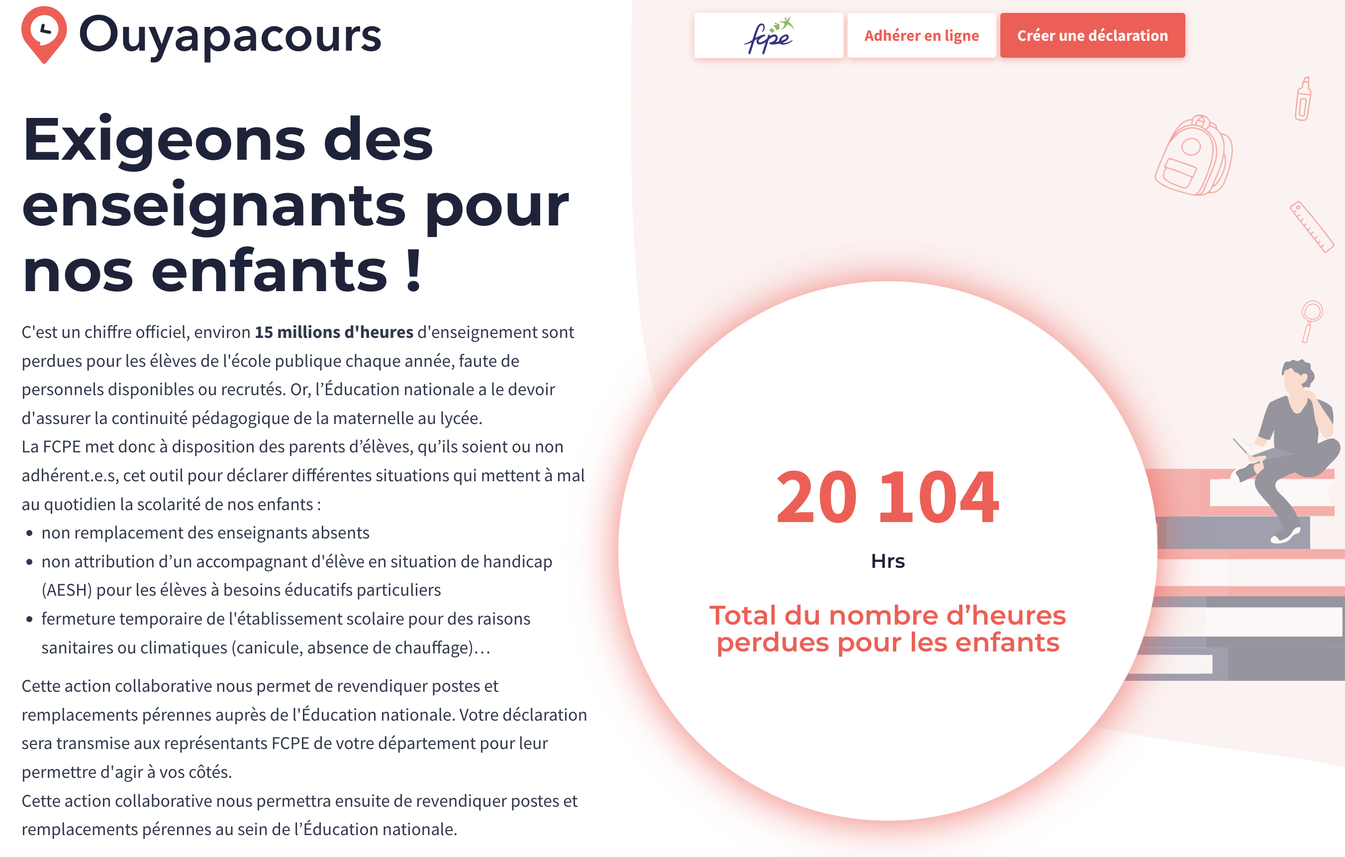 | Déjà plus de 20 000 heures de cours non remplacées, c’est le chiffre au compteur du site Ouyapacours géré par la FCPE, à la veille des vacances de fin d’année ! Aujourd’hui plus que jamais, continuez à nous signaler via la plateforme : - le non-remplacement des enseignants absents ; - la non-attribution d’un accompagnant d'élève en situation de handicap (AESH) pour les élèves à besoins éducatifs particuliers ; - les fermetures temporaires de l'établissement scolaire pour des raisons sanitaires ou climatiques (absence de chauffage ou insalubrité). Plus nous avons une photographie proche de la réalité de ce que vous vivez dans les établissements scolaires où vous êtes parents d’élèves, plus nous avons des arguments à avancer auprès de l’Éducation nationale pour que la situation change et que nos enfants aient les enseignements auxquels ils ont le droit ! |